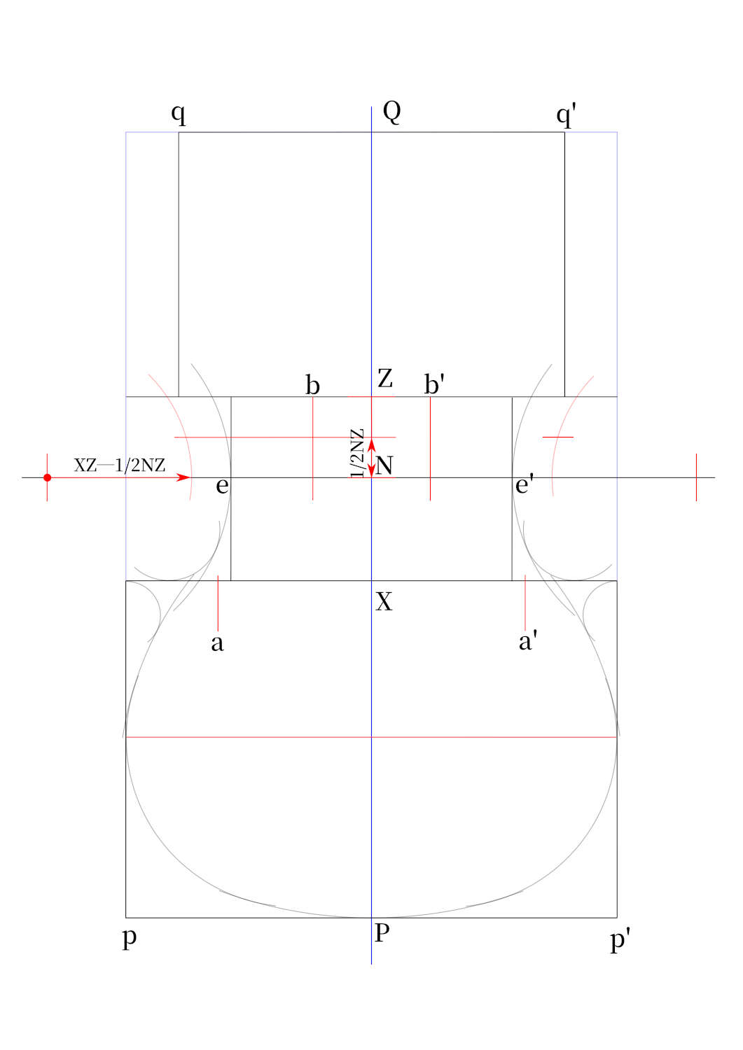 N線上のXZの弧を描いたのと同じ中心から、今度は、XZ-1/2XNを半径とした弧をN線から下の部分だけで良いので、描きます。