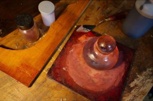 この楽器のニスに色をつけるために使用したのは、インド産の茜の根から作った自家製の色の粉(顔料)とクルミの殻から作った同じく自家製の色の粉です。
